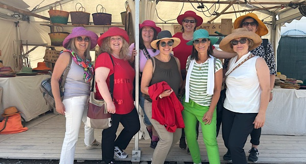 Und was passiert, wenn acht fröhliche Frauen mit Hüten auftauchen? Die Verkäuferin erkannte uns sofort. Wer konnte da widerstehen? Auch unsere „noch Unbehüteten“ ließen sich überzeugen und stürzten sich ins fröhliche Probieren. Es wurde gelacht, geknipst, kommentiert – und ehe wir uns versahen, hatten wir sogar andere Festivalgäste angesteckt.