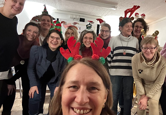 Unsere Partnerinnen‑Weihnacht der Juice‑Plus‑Familie führte uns dieses Jahr nach Moos. Lydia hatte im Lokal SchiefenEder einen Tisch für uns reserviert, und wir schmückten uns festlich mit weihnachtlichen Haarreifen. Eine Servicekraft machte das Gruppenfoto. Ihr Kollege gesellte sich spontan zu uns. Natürlich bekam auch er ein kleines Mützchen, weil er den Spaß so herzlich mitmachte.